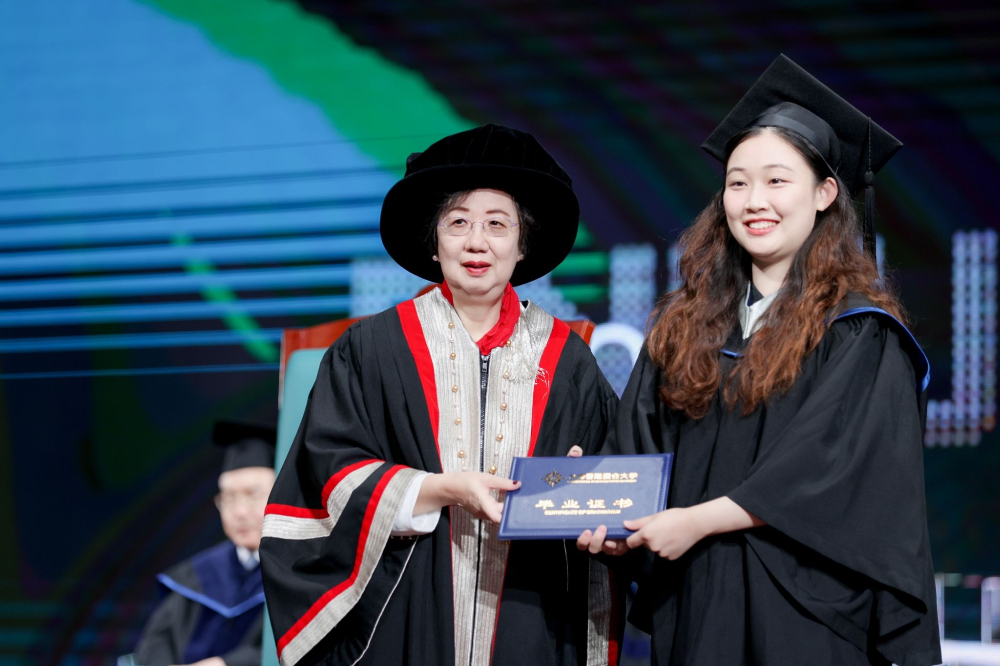 BNBU Associate Vice President (Student Development) Prof Stella Cho presents a graduation certificate to a graduate
