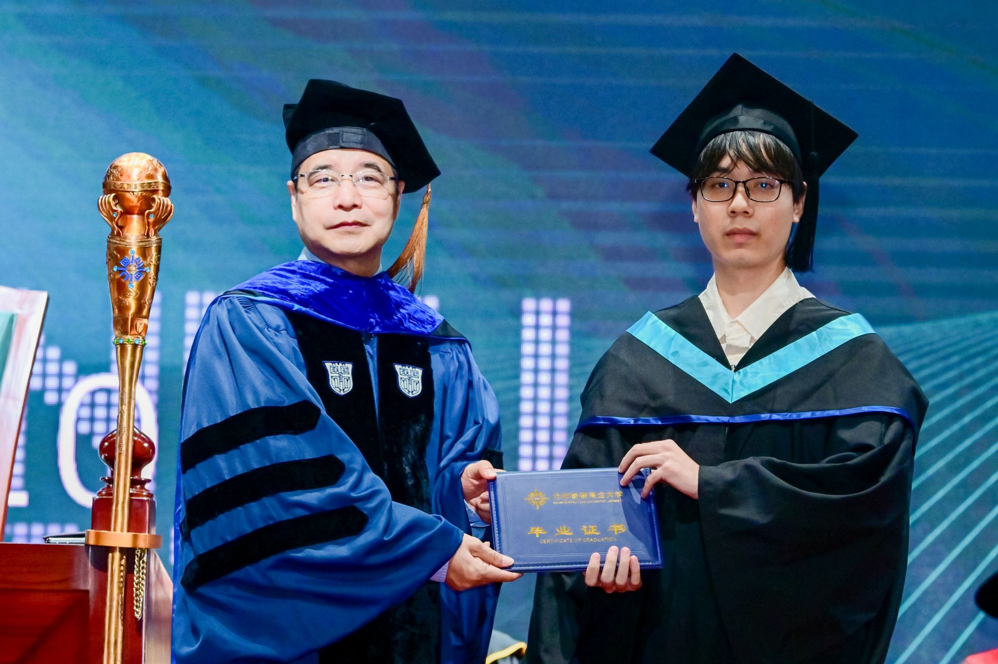 BNBU Provost Prof Patrick Chau presents a graduation certificate to a graduate
