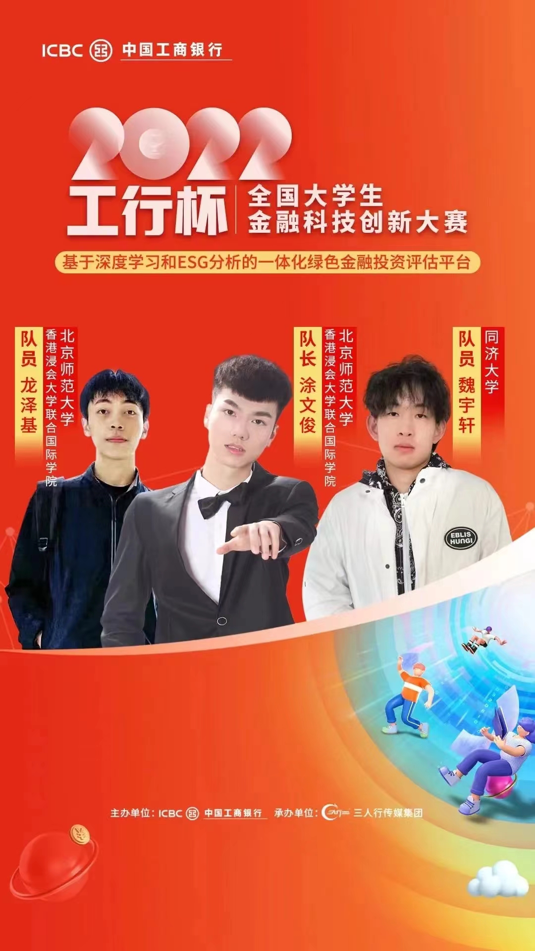 Two UIC students, Tu Wenjun and Long Zeji, both of the Faculty of Business and Management (FBM), won first prize with the first overall score nationwide at the ICBC FinTech Innovation Competition for National College Students with their teammate Wei Yuxuan from Tongji University. The team was guided by Dr Zhan Ge of FBM.