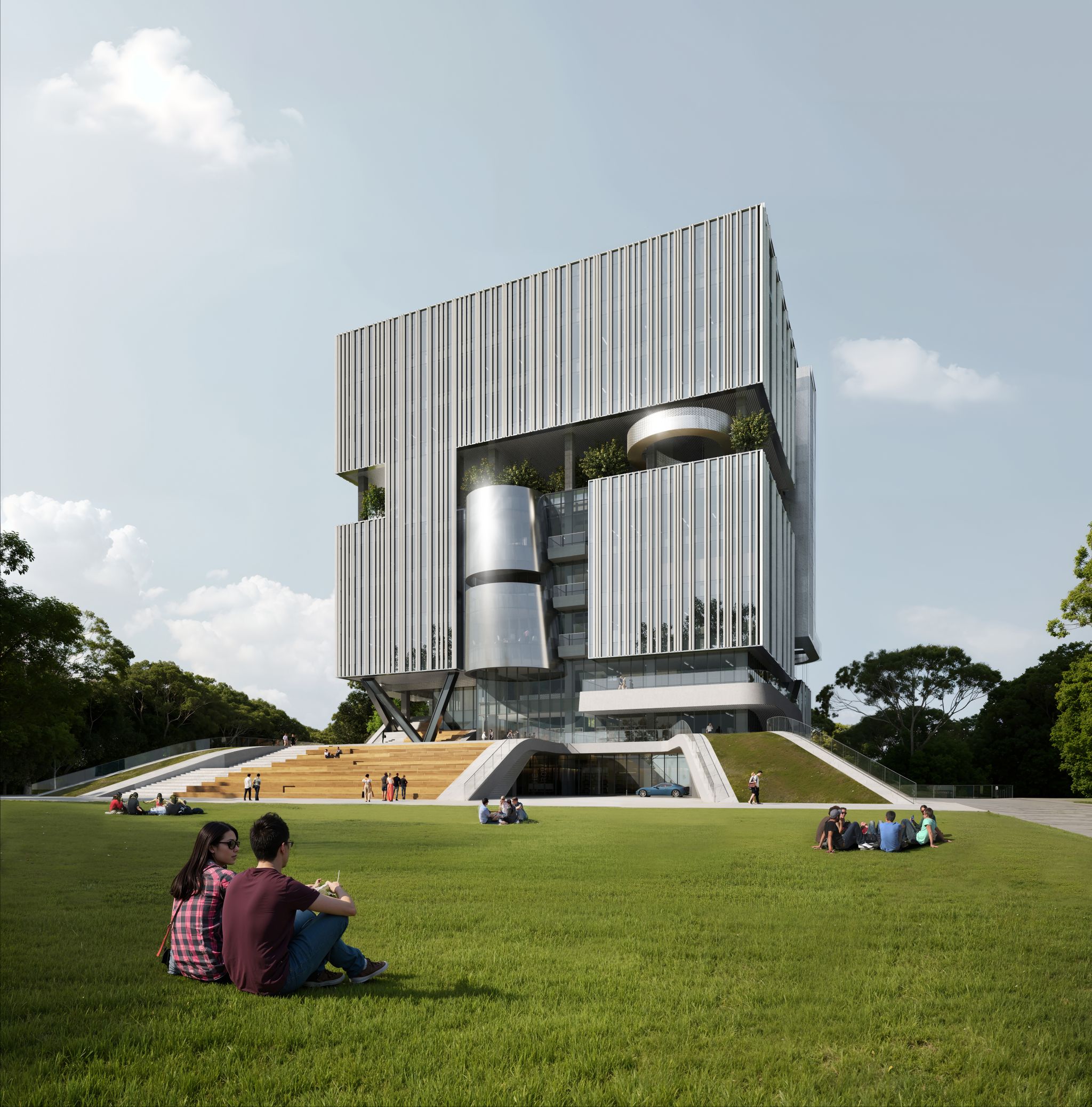 Located at the heart of the Phase II campus, the Learning Resource Centre and Laboratory Complex integrates a multifunctional library, laboratories, shared public service spaces, and a sky garden. The building features a distinctive cubic form that marries architectural order with creative flair.