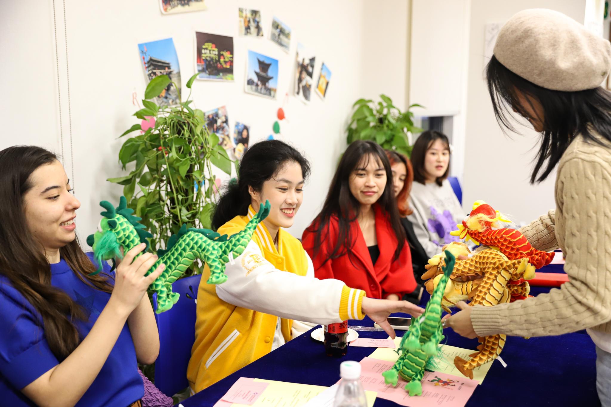 Students receive a gift: stuffed dragons designed after the dragon from the animated movie Mulan