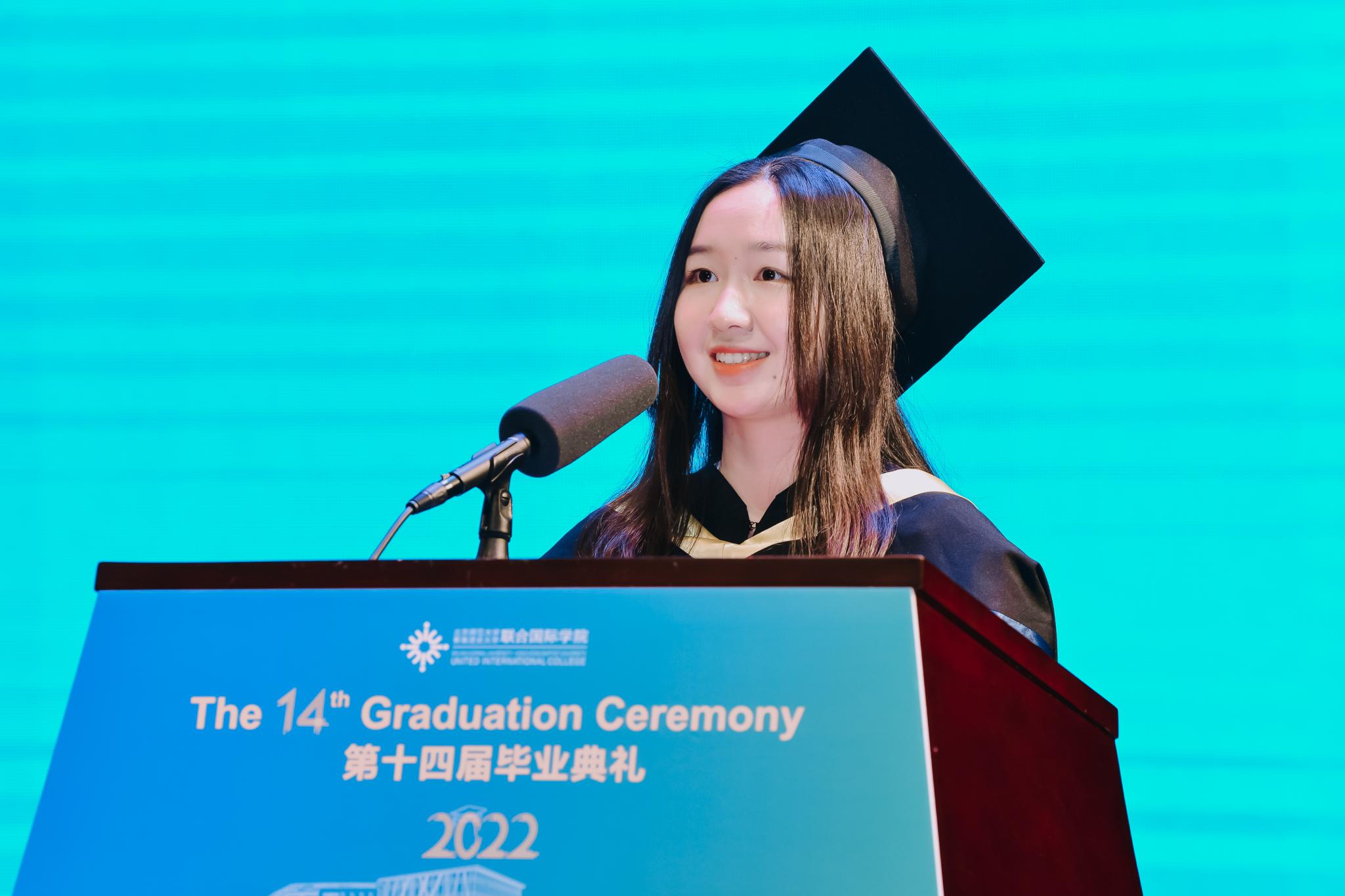 I want to share three key lessons from the rich harvest of experiences we have enjoyed. The first is that the definition of excellence is multi-dimensional. Here I think of Jasmine, the president of the UIC Soup Kitchen Charity Association. She did not just spend her time in the library but conducted a field survey at Shengli Primary School, Heyuan City, here in Guangdong Province, and raised 7000 yuan in funding to solve its shortage of drinking water. Number two: what goes around, comes around. My fellow student Beatrice used to complain, in frustration, that she could not digest all the knowledge that her major demanded. But guess what: she applied herself quantitative research methods and ended up with the best Final Year Project of GIR. Lesson number three: think outside the box. I'm one of the students with the highest grade point average in this class. I should have pursued graduate study following the routes, but I did not because I discovered my interest in scouting talents on the internet. Hence, I approached this industry from the top, and in barely one year, I got a special offer from Bilibili that was awarded to the best graduates of their year.