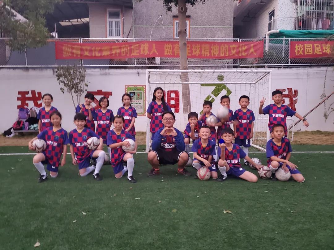 严雨琦(中)和下湖小学的足球小将们