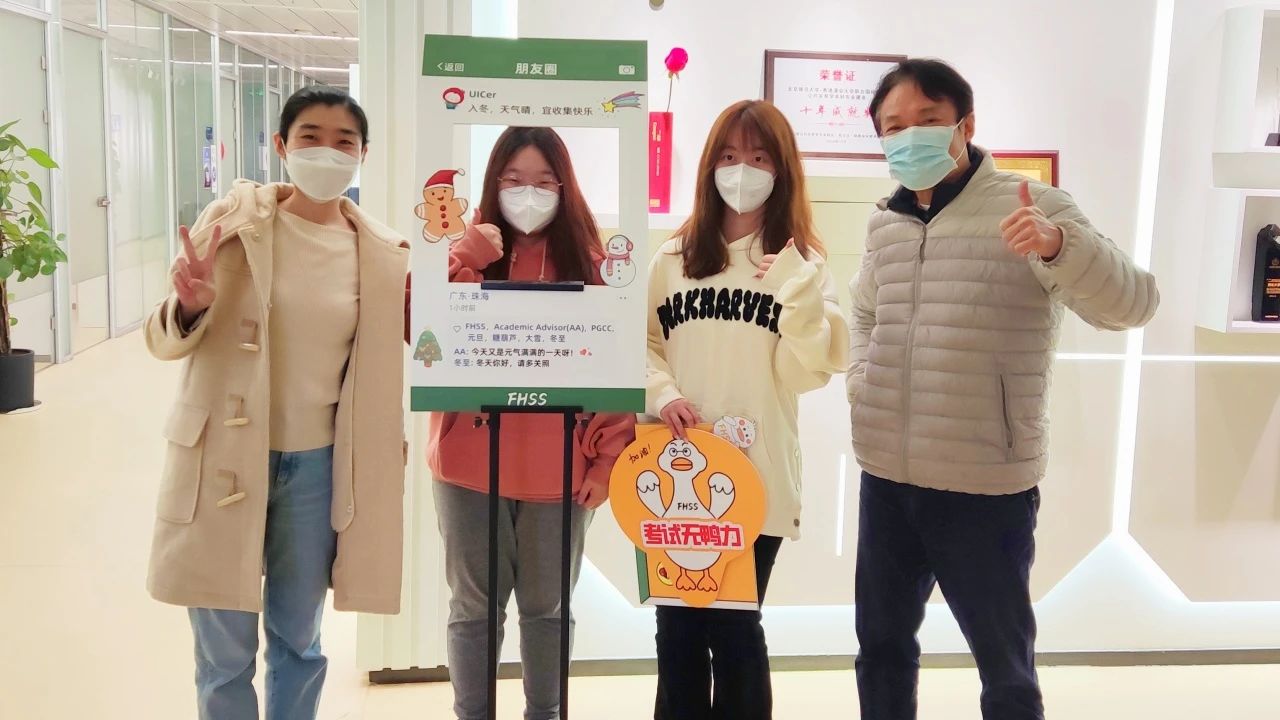 黄清韵(右二)和同学与FHSS副院长(研究与发展)赵晓斌教授(右一)、武爽博士(左一)合影