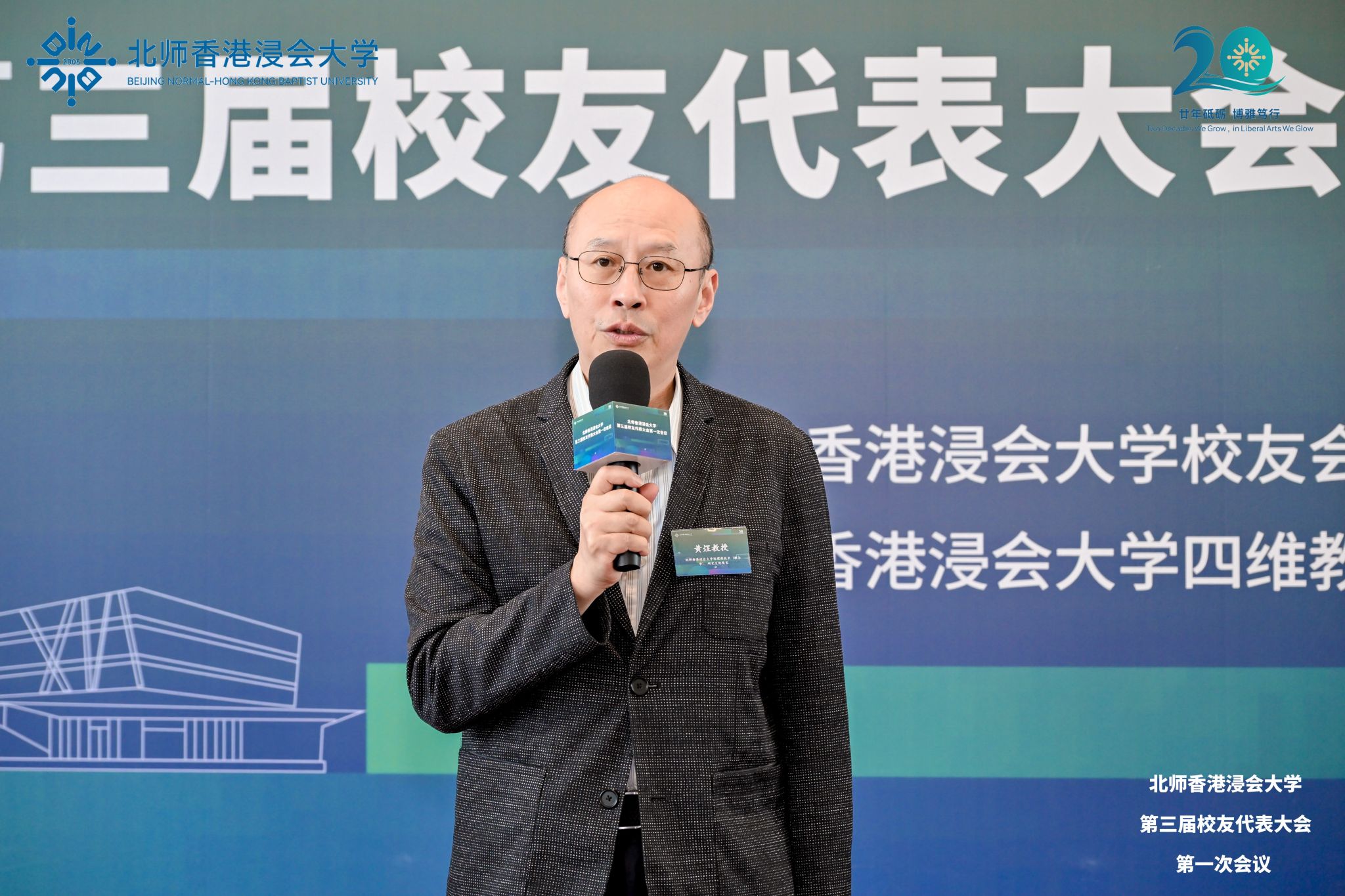 协理副校长黄煜教授向返校校友致以热烈欢迎,并提及今年适逢北师港浸大建校二十周年,为此,学校推出"校友暨北师港浸大之友同心项目",该项目倡导"涓流汇海"的公益理念,旨在凝聚校友力量,共筑发展基石。