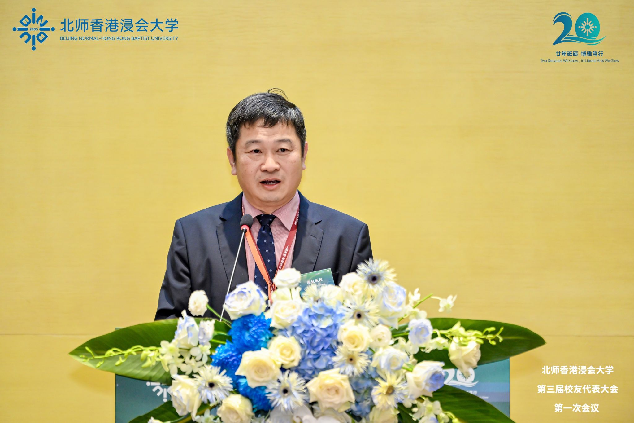 第二届校友会会长张韶峰先生则简要总结了校友会过去四年的工作进展。他提到,近年来校友会规模持续扩大,并指出,校友会始终是联结学校与全球校友的重要纽带,也是北师港浸大博雅教育精神的延续,他期待校友们同心协力,共同为母校的长远发展贡献力量。