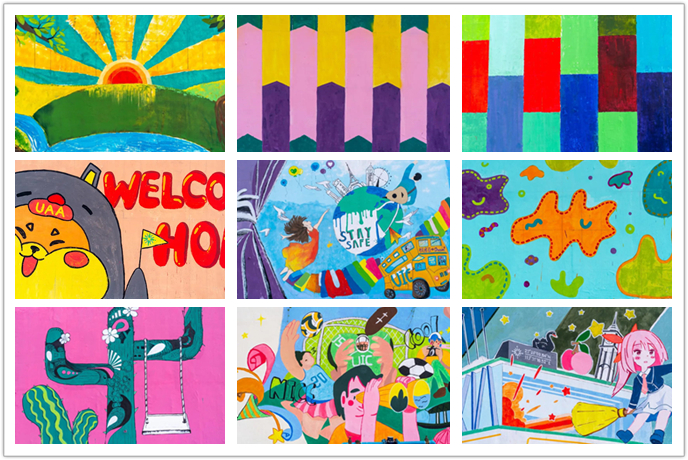 本次涂鸦墙的设计及呈现效果全部由UIC师生共同完成。参赛作品围绕“大学小镇、博雅教育、环保意识、社会话题、校园文化、传统文化特色课程”六大主题内容进行创作,既结合了UIC的校园建筑风格,同时融入时代文化元素。