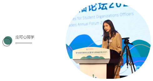 学生会干事会主席庄可心作为学生代表致辞,号召学生领袖坚持“服务学生,提高自我”的理念,共同创建高效、透明的服务型学生组织,同时欢迎全体同学一起参与到学生组织的监督和建议中,促进学生组织的发展。