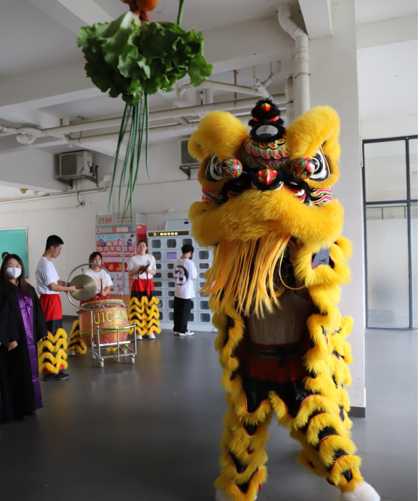 2023年2月6日中午,校园锣鼓喧天。各苑舍的舍监和苑舍学生委员会成员在苑舍门口迎接醒狮“采青”。利是(红包)与生菜悬挂于苑舍门梁,醒狮高高跃起采下“福气”,为师生送祝福。