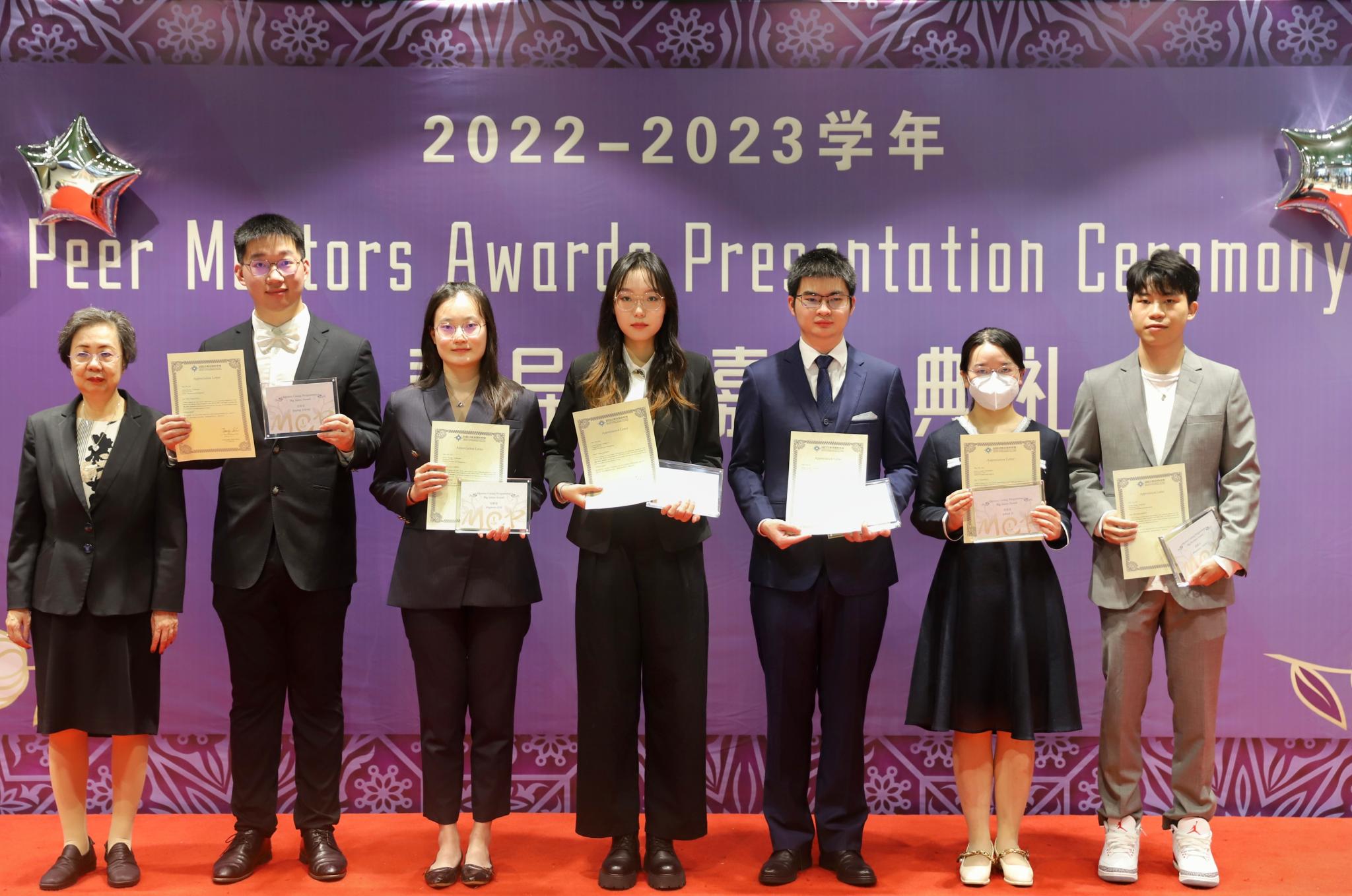 左龙佩兰教授,人文社科学院副院长(研究与学生事务)赵晓斌教授,工商管理学院助理院长翁祉泉博士,理工科技学院助理院长(学生与外务)邓宇辉博士,文化与创意学院助理教授袁美珍博士,学生事务总监、工商管理学院副教授汤绍龙博士出席典礼并为同学颁奖。