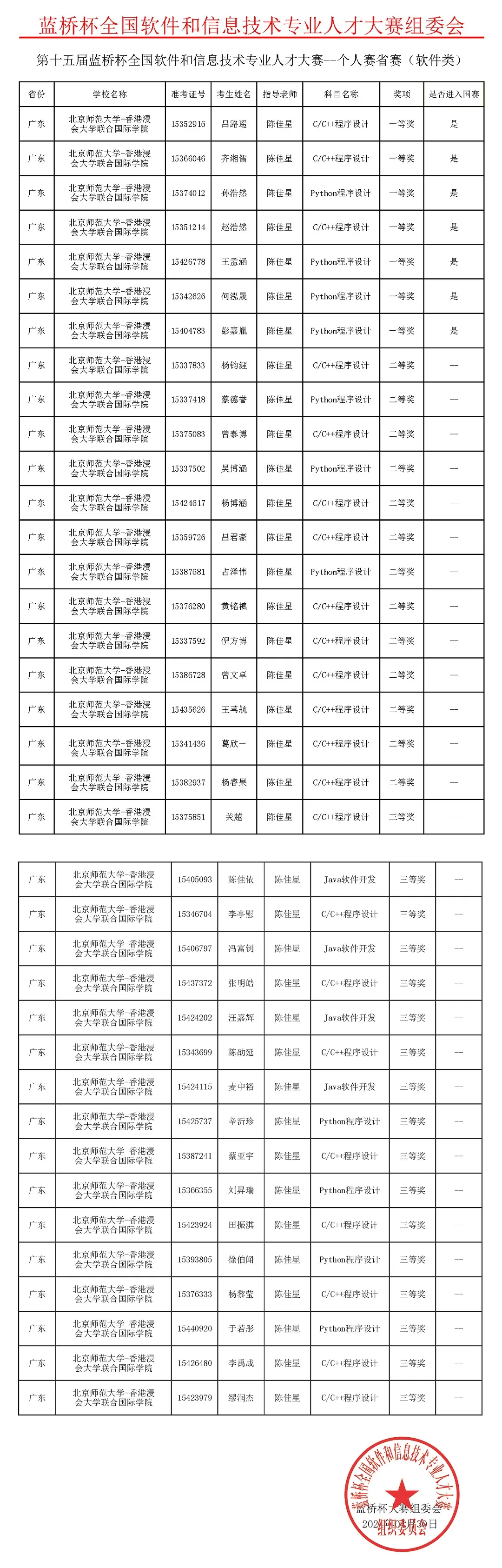 第十五届“蓝桥杯”全国软件和信息技术专业人才大赛个人赛结果近日揭晓,北师港浸大(UIC)学子在本次比赛中表现优异,获奖项数量创历史新高。计算机科学系的吕路遥和王孟涵各获得国家二等奖,齐湘儒、赵浩然和彭嘉胤各获得国家三等奖。除此之外,学子们还斩获了7项省一等奖、13项省二等奖、17项省三等奖,共计37个省级奖项。