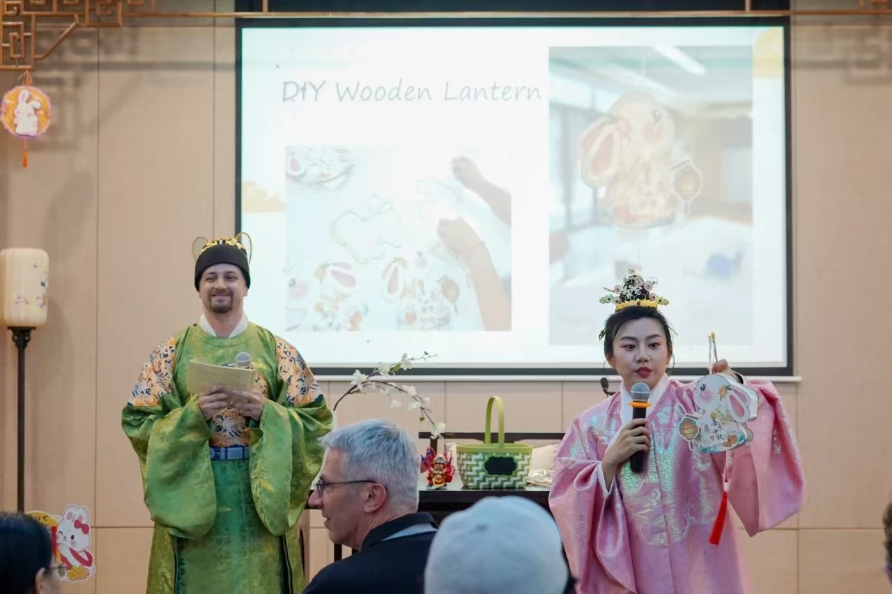 欢声笑语间,师生酌香茗、品月饼、制灯笼、猜灯谜,其乐融融。活动现场还安排了汉服介绍环节,向国际师生展示了华夏服章之美。