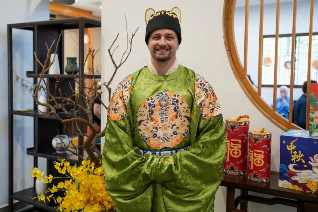 通识教育学院讲师Jonathan Austin担任主持人,这是他第一次穿汉服。他说:“这些衣服是由北师港浸大中国语言文化中心龚元之博士准备的。我很喜欢,也明白它们为什么那么受欢迎了。”
