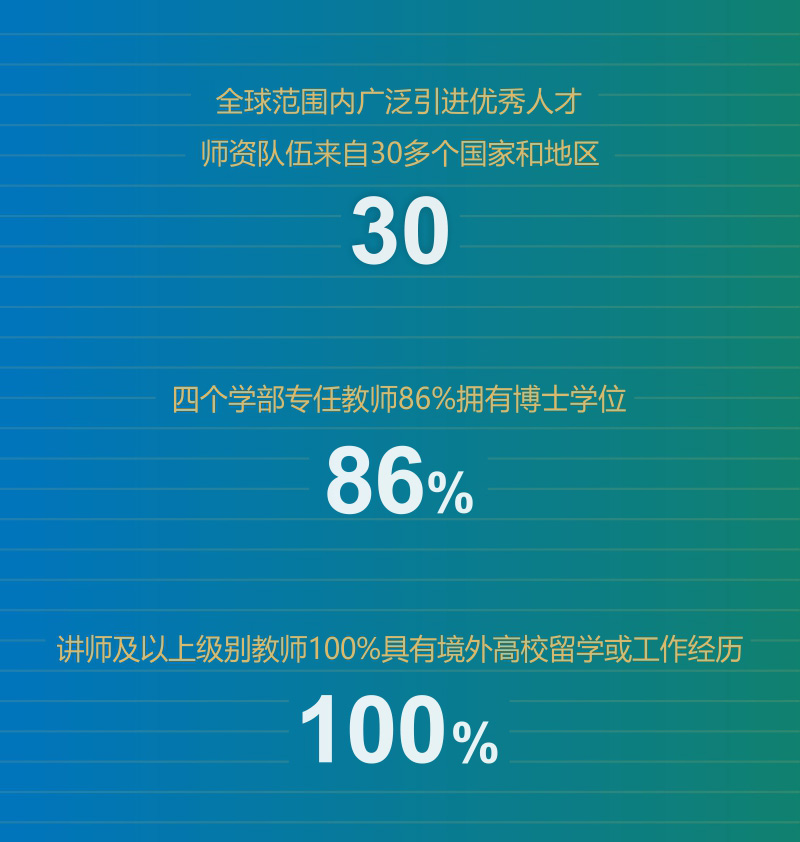 教学和科研是大学的核心动力,打造国际化的师资队伍和科研团队是重中之重。北师港浸大的师资队伍来自30多个国家和地区,其中讲师及以上级别教师100%具有境外高校留学或工作经历,不少教师来自斯坦福大学、哈佛大学、牛津大学、剑桥大学等世界名校。近一年来,学校在全球范围内广泛引进优秀人才,不断优化升级师资和科研队伍,多位重量级专家和学者陆续加盟。【推荐阅读:走进UIC | 以“人”为本,激发教研“双动力”】