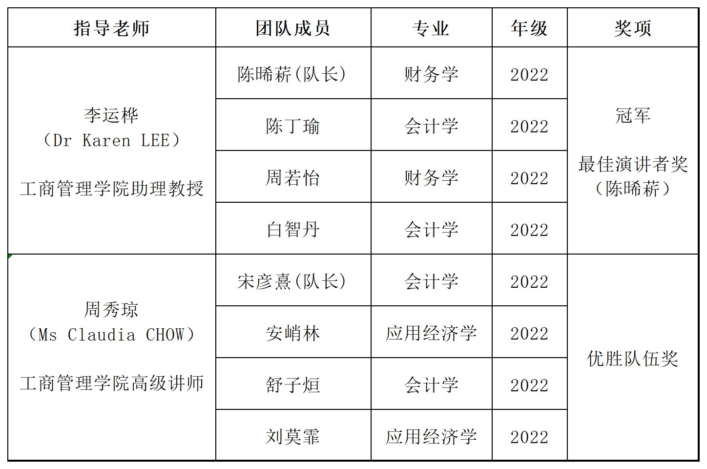 2023年12月2日,北师港浸大(UIC)工商管理学院学生在香港会计师公会商业个案比赛中载誉而归,其中陈晞菥、陈丁瑜、周若怡、白智丹组成的队伍斩获冠军,队长陈晞菥获颁最佳演讲者奖。