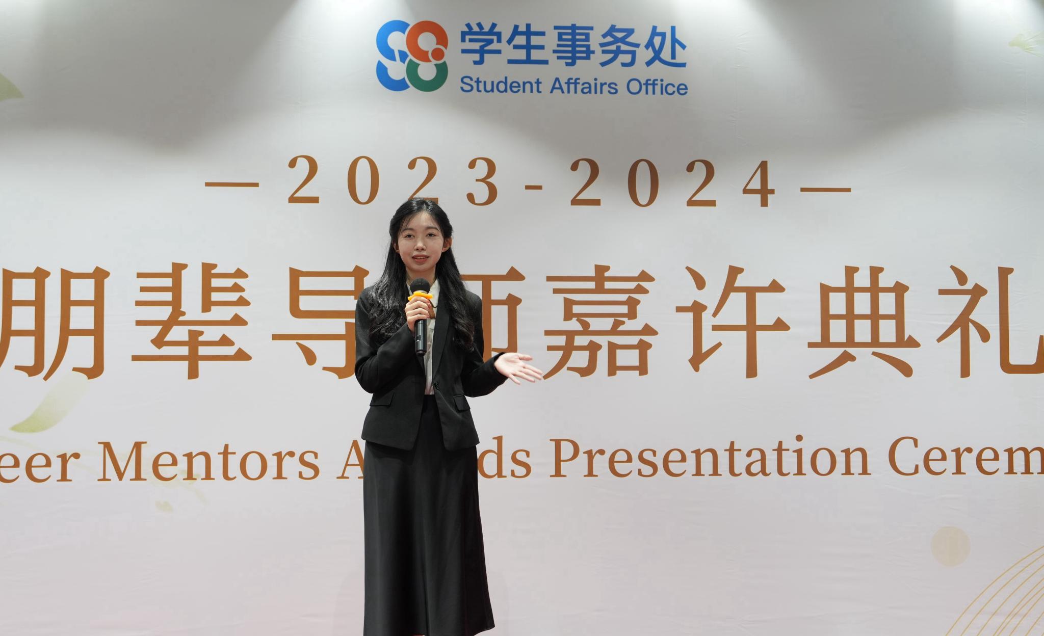 在嘉许典礼上,米雪儿的好搭档、同样连续三年担任朋辈导师的公共关系与广告学的刘书源也分享了自己的感受。对他来说,当初选择成为朋辈导师的原因很简单:想认识更多的朋友,弥补自己新生时期没能和朋辈导师参加很多活动的遗憾。
