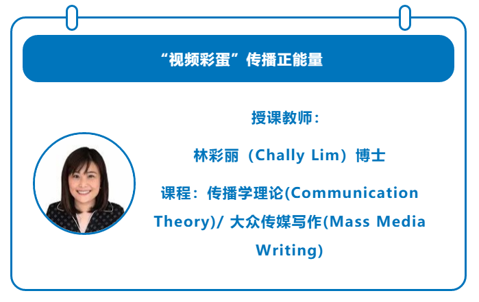 公共关系与广告学专业的林彩丽(Chally)博士来自马来西亚,这学期教授两门课。Chally说:“当UIC宣布要开展网络教学的时候,我其实已经想到我需要一个独特的方式来吸引他们的注意力。”