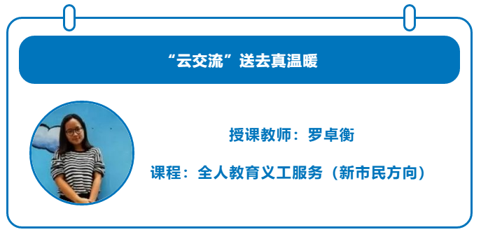 “网络教学对于体验式学习课程来说是个挑战,但是接受这样的挑战并且尝试新的方法,是个很有趣的过程。学生也格外珍惜与服务对象线上交流的机会,都主动打开摄像头,体验了一回当‘主播’的感受。”罗卓衡老师说。
