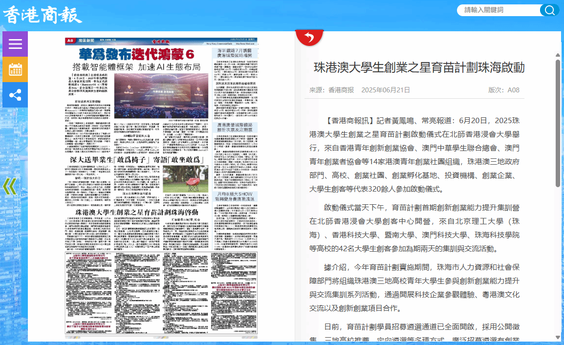 【香港商報訊】記者黃鳳鳴、常亮報道:6月20日,2025珠港澳大學生創業之星育苗計劃啟動儀式在北師香港浸會大學舉行,來自香港青年創新創業協會、澳門中華學生聯合總會、澳門青年創業者協會等14家港澳青年創業社團組織,珠港澳三地政府部門、高校、創業社團、創業孵化基地、投資機構、創業企業、大學生創客等代表320餘人參加啟動儀式。