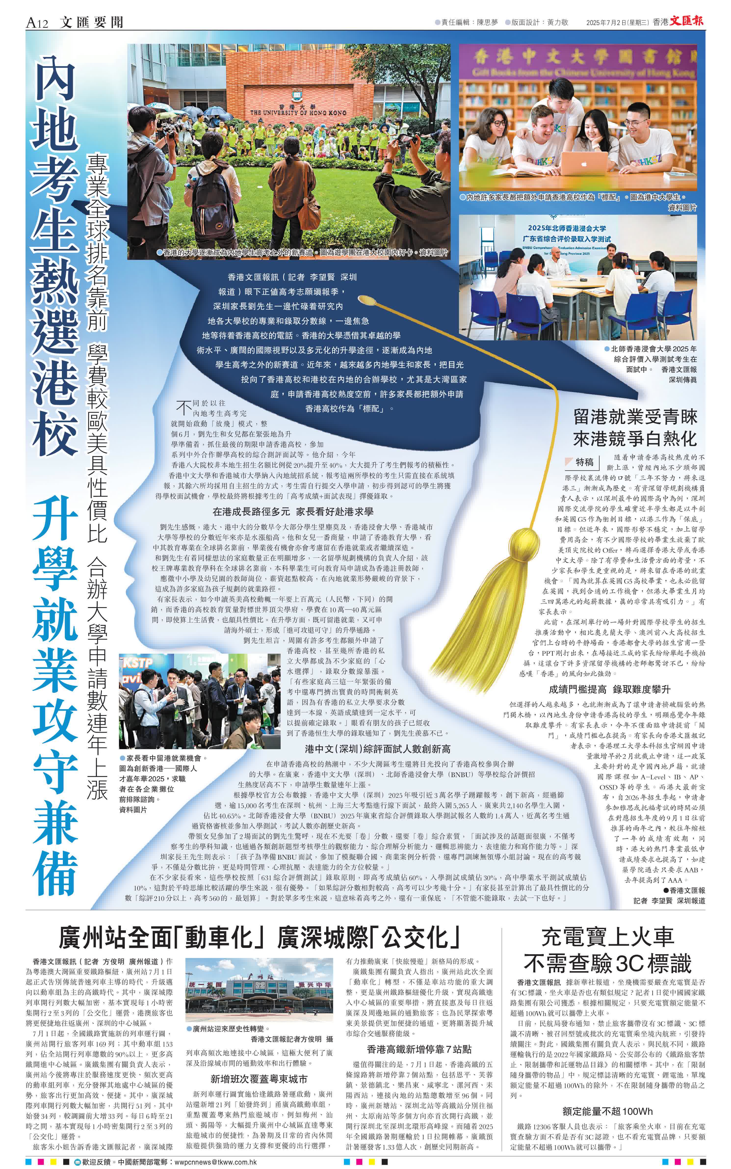 香港文匯報訊(記者 李望賢 深圳報道)眼下正值高考志願填報季,深圳家長劉先生一邊忙碌着研究內地各大學校的專業和錄取分數線,一邊焦急地等待着香港高校的電話。香港的大學憑借其卓越的學術水平、廣闊的國際視野以及多元化的升學途徑,逐漸成為內地學生高考之外的新賽道。近年來,越來越多內地學生和家長,把目光投向了香港高校和港校在內地的合辦學校,尤其是大灣區家庭,申請香港高校熱度空前,許多家長都把額外申請香港高校作為「標配」。