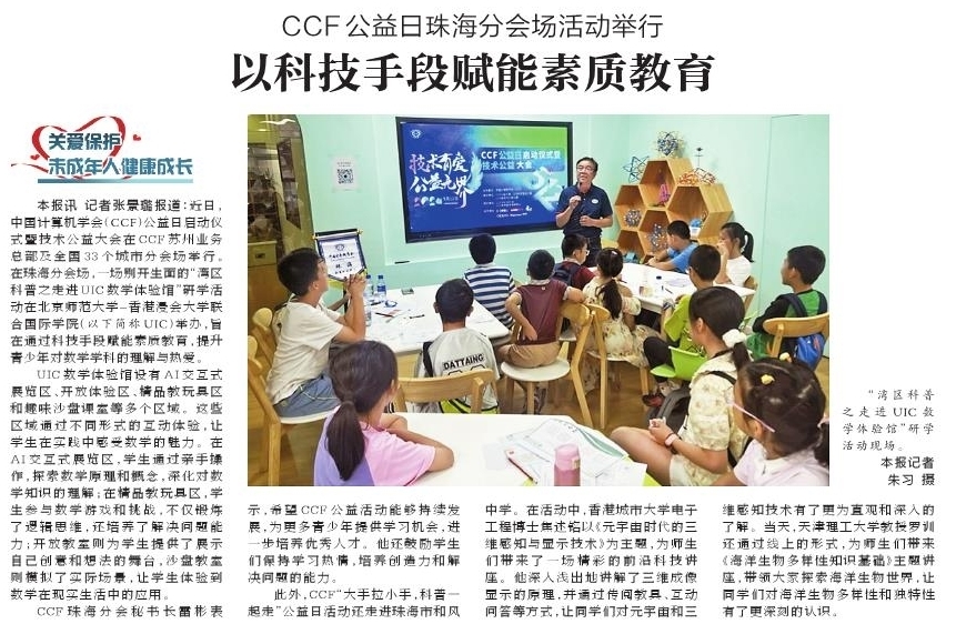 本报讯 记者张景璐报道:近日,中国计算机学会(CCF)公益日启动仪式暨技术公益大会在CCF苏州业务总部及全国33个城市分会场举行。在珠海分会场,一场别开生面的“湾区科普之走进UIC数学体验馆”研学活动在北京师范大学-香港浸会大学联合国际学院(以下简称UIC)举办,旨在通过科技手段赋能素质教育,提升青少年对数学学科的理解与热爱。