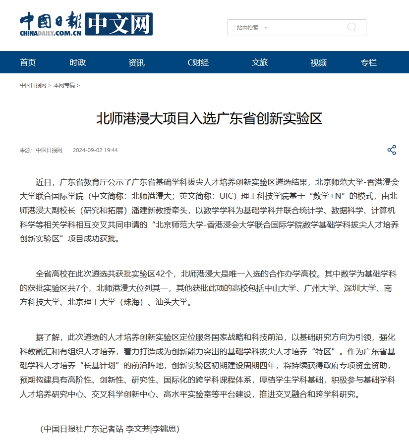 近日,广东省教育厅公示了广东省基础学科拔尖人才培养创新实验区遴选结果,北京师范大学-香港浸会大学联合国际学院(中文简称:北师港浸大;英文简称:UIC)理工科技学院基于“数学+N”的模式,由北师港浸大副校长(研究和拓展)潘建新教授牵头,以数学学科为基础学科并联合统计学、数据科学、计算机科学等相关学科相互交叉共同申请的“北京师范大学-香港浸会大学联合国际学院数学基础学科拔尖人才培养创新实验区”项目成功获批。