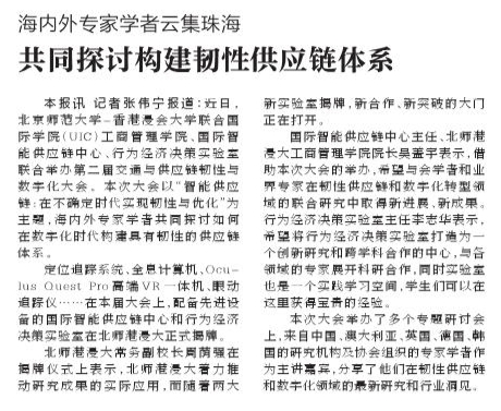本报讯 记者张伟宁报道:近日,北京师范大学-香港浸会大学联合国际学院(UIC)工商管理学院、国际智能供应链中心、行为经济决策实验室联合举办第二届交通与供应链韧性与数字化大会。本次大会以“智能供应链:在不确定时代实现韧性与优化”为主题,海内外专家学者共同探讨如何在数字化时代构建具有韧性的供应链体系。
