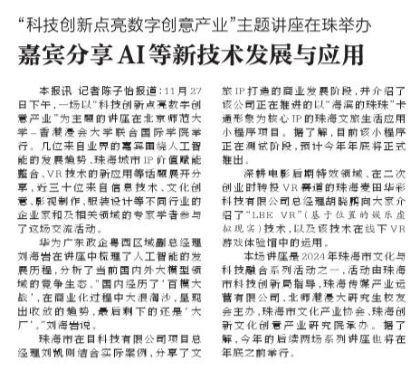 本场讲座是2024年珠海市文化与科技融合系列活动之一,活动由珠海市科技创新局指导,珠海传媒产业运营有限公司、北师港浸大研究生校友会主办,珠海市文化产业协会、珠海创新文化创意产业研究院承办。据了解,今年的后续两场系列讲座也将在年底之前举行。