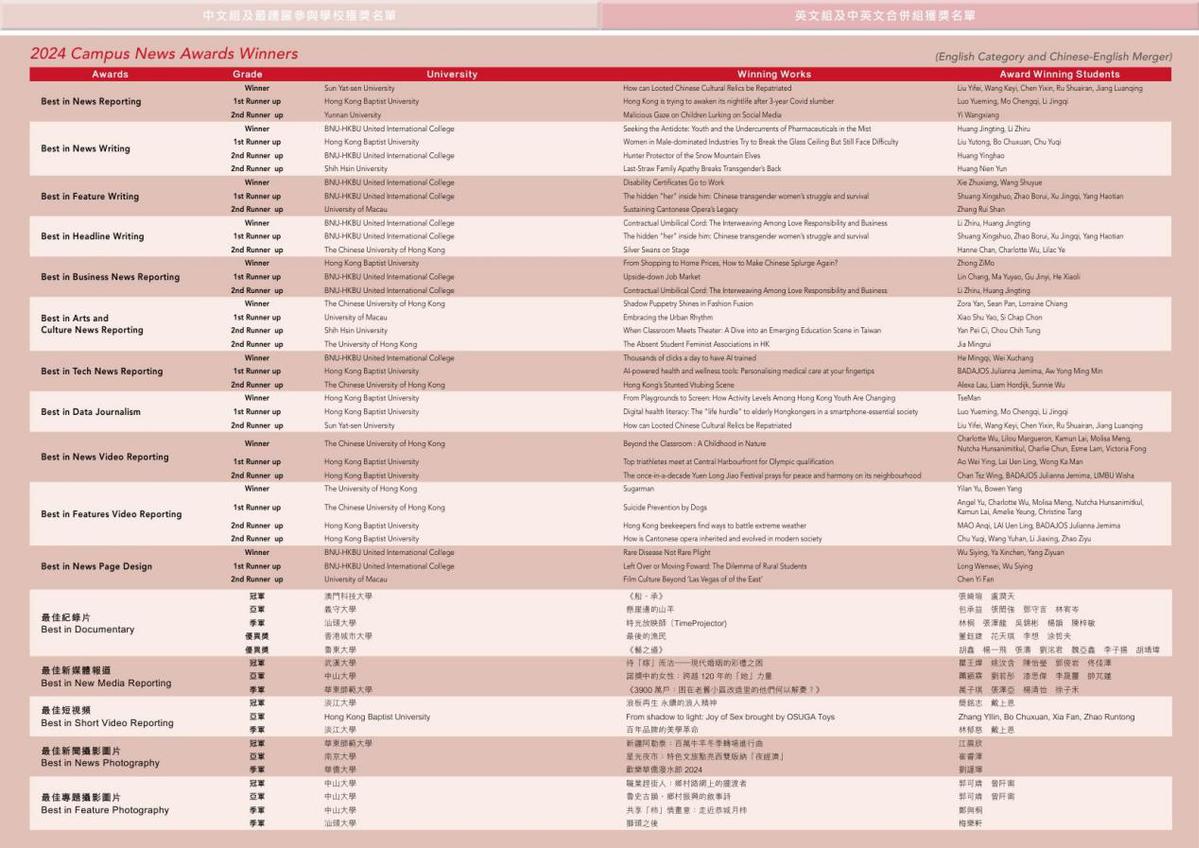 “大学新闻奖”(前名为“校园学报新闻奖”)评选活动创办于2012年,旨在鼓励高校学生积极参与校园新闻报道,锻炼新闻写作能力以及多媒体制作、运用能力,目前已成为唯一面向海峡两岸暨港澳地区大学校园新闻学子的交流互动平台。今年大学新闻奖共收到海峡两岸暨港澳地区超过90间院校的近1000份中英文作品, 参赛人数逾3000人。奖项设置涵盖中英文写作、摄影、设计等多个领域,例如最佳数据新闻奖、最佳新闻写作、最佳版面设计、最佳纪录片、最佳新闻摄影图片、Best in Arts and Culture News Reporting、Best in Business News Reporting等,凸显了新闻学的专业性与丰富性,体现了新闻学科与时俱进的特点。
