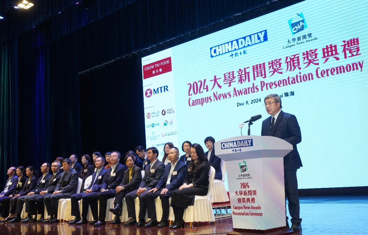 由中国日报主办的2024大学新闻奖颁奖典礼于12月9日在北京师范大学-香港浸会大学联合国际学院(UIC)举行。香港特别行政区政务司副司长卓永兴、北京师范大学-香港浸会大学联合国际学院校长陈致、周大福珠宝集团董事总经理黄绍基现场致辞,中国日报社副总编辑兼香港版总编辑周立致欢迎辞,香港迪士尼乐园传讯及公共事务副总裁黎珮珊在中场发表演讲。今年,大学新闻奖组委会还于颁奖典礼前后组织师生参访团,到周大福顺德匠心智造中心及珠海太空中心参访交流,深入了解大湾区的商业与科技发展文化。