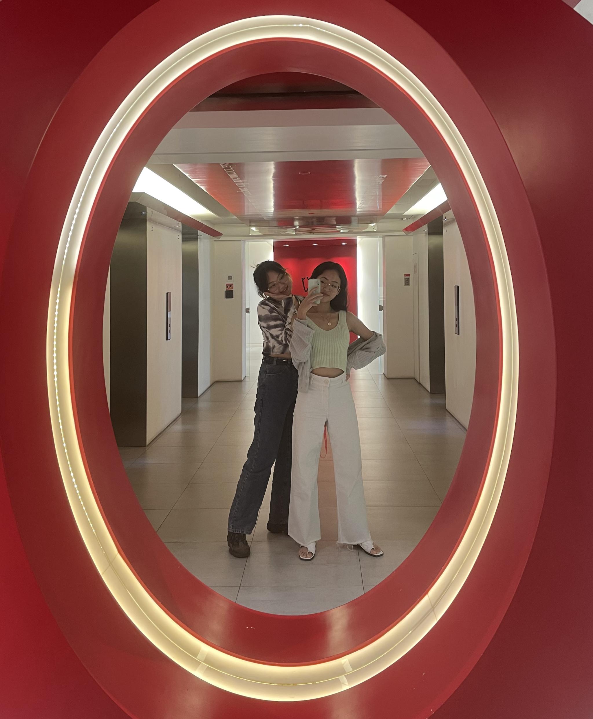 敬霈(左)与同期实习生“打卡”办公室里随处可见的“奥美红”