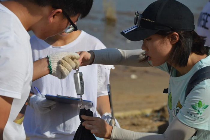刘天彤在淇澳岛参加净滩活动,清理海滩垃圾