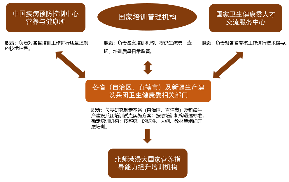 北师港浸大国家营养指导能力提升培训试点机构是由在国民营养健康指导委员会领导协调下,国家卫生健康委食品司组织开展工作。此外,基地培训工作的质量控制技术指导由中国疾控中心营养与健康所负责。国家卫生健康委人才交流服务中心负责对工作进行技术指导。