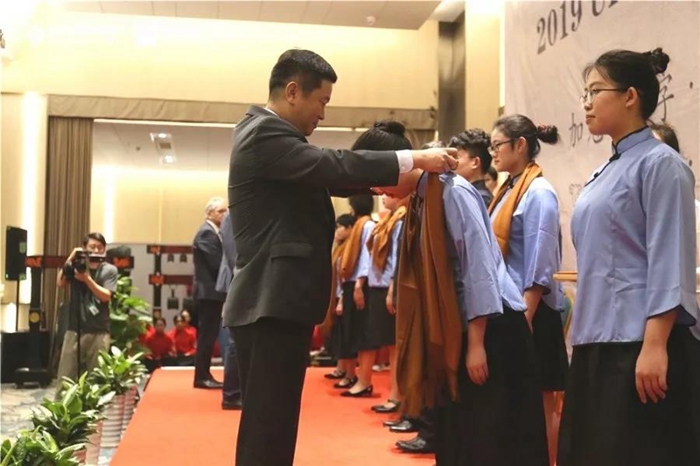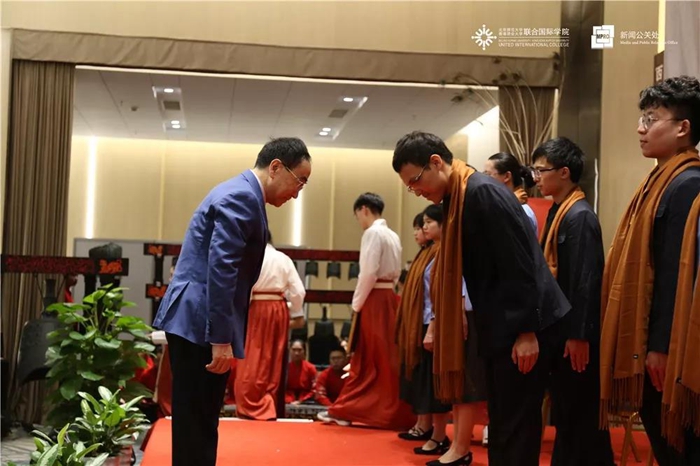 完成三加冠之后,学子“明志聆训”,依次对父母、师长表明志向并鞠躬致谢,现场观众为其成人表示衷心祝贺。每届参礼学生均取校训“博文雅志,真知笃行”中一字取字,此次参礼的十位学生成为了UIC的“雅”字辈。