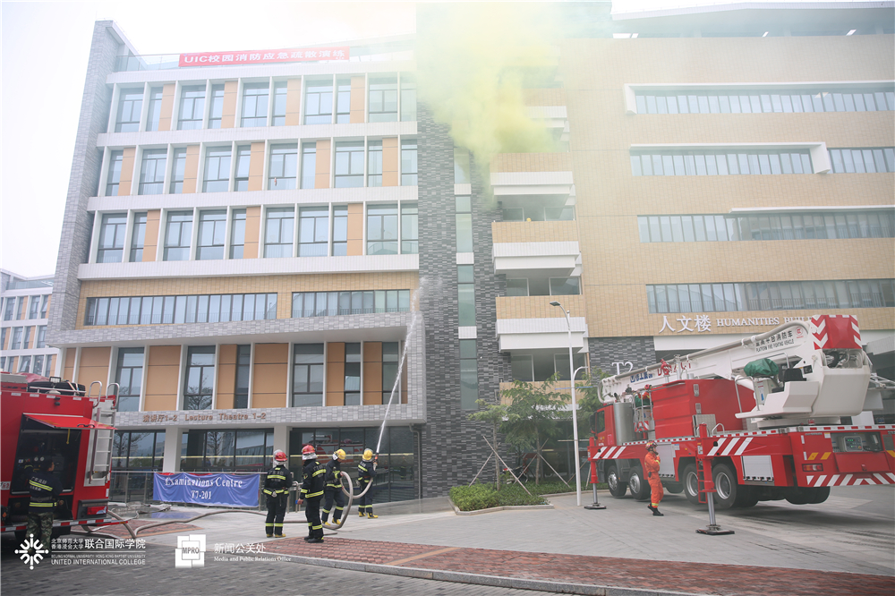 除了军事训练和禁毒宣传、国家安全知识、消防知识等讲座,1月4日下午,珠海市消防局高新大队还组织官兵带领同学们开展消防应急疏散演练。演练假设学校T2栋教学楼五楼发生火灾,楼顶有一名学生被困。