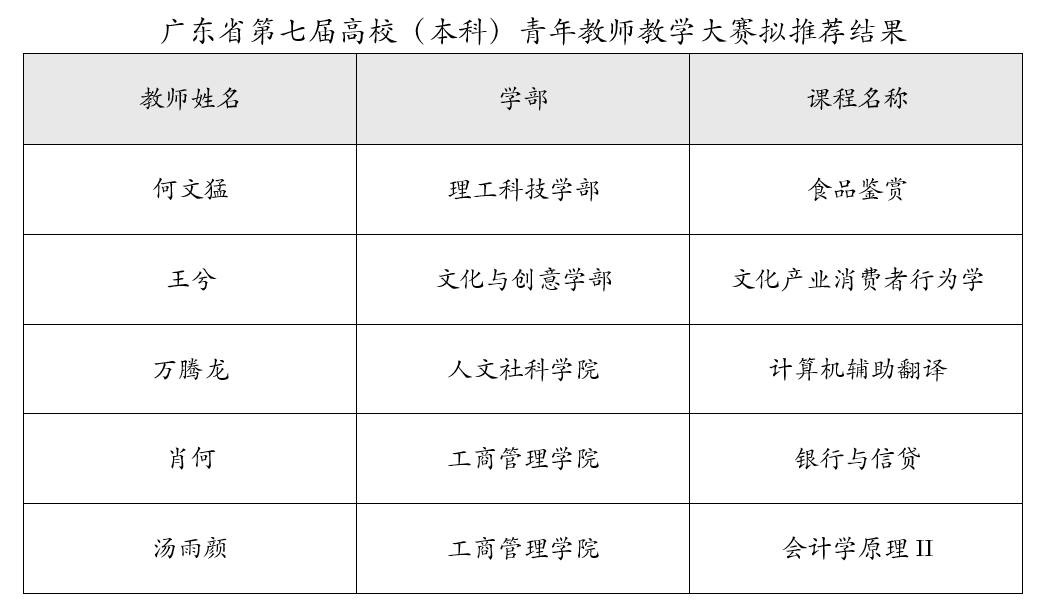 根据广东省教育厅发布的《关于举办广东省第七届高校(本科)青年教师教学大赛的预通知》文件要求,学校组织开展校赛,经个人申报,专家遴选,择优推荐以下五名教师参加本次省赛,现予以公示。