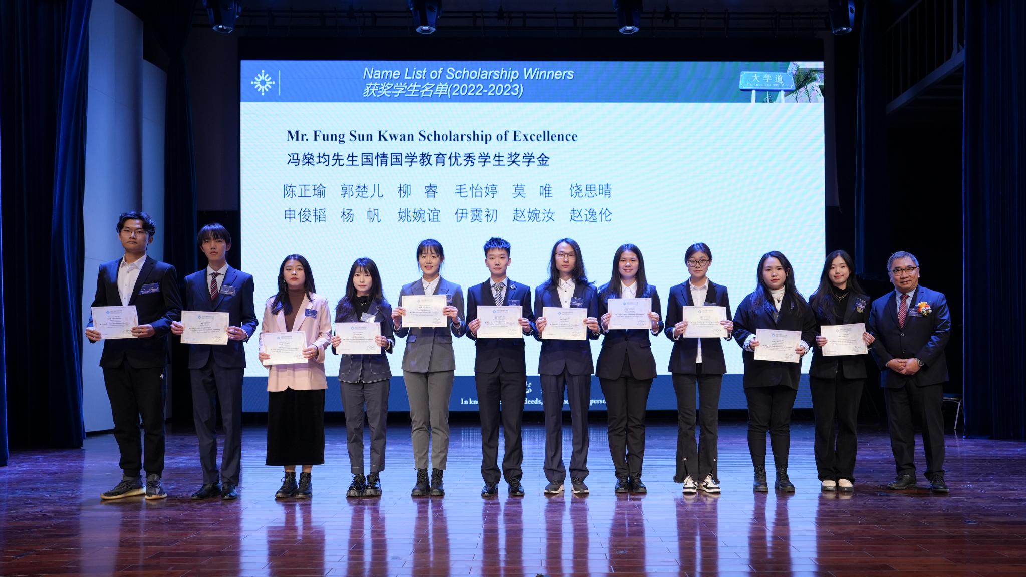 UIC senior management including Provost Prof Patrick Chau, Party Secretary of the College Party Committee, Vice President (Administration) Prof Mao Yaqing, Associate Vice President (Student Development), Acting Dean of School of General Education Prof Stella Cho, Associate Vice President (Internationalisation), Dean of Faculty of Science and Technology Prof Pan Jianxin, Academic Registrar Prof Li Jianhui with Director of Fung Sun Kwan Chinese Arts Foundation Prof Lee Hung-kai and CEO of Guangdong Medical Valley Mr Xie Jiasheng presented the scholarships to the awarded students.