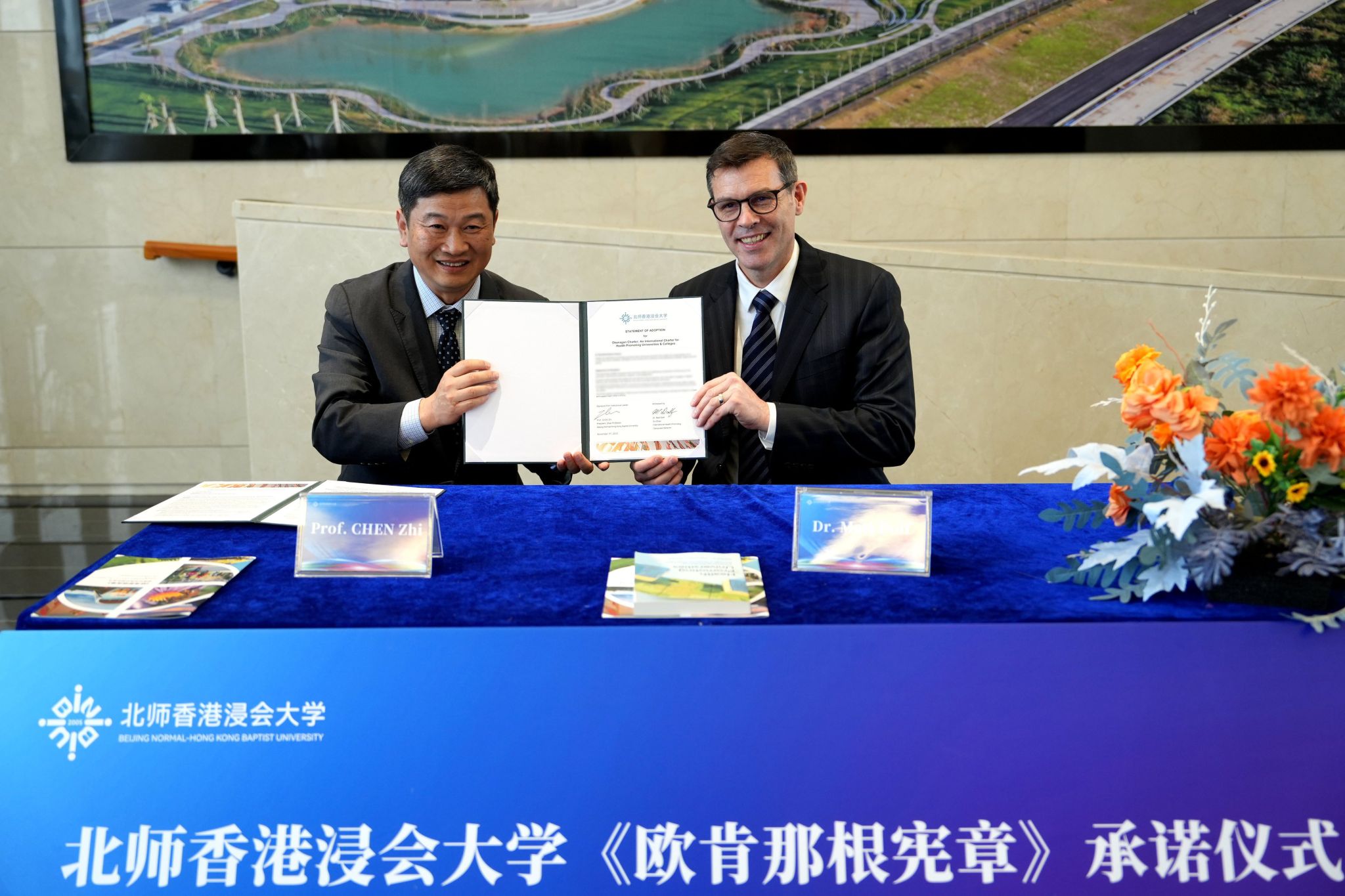 Dr Matt Dolf, Co-Chair of the International Steering Committee of Health Promoting Campuses Network, and Director of Center of Well-being Strategy at the University of British Columbia (right) and BNBU President Prof Chen Zhi at the ceremony