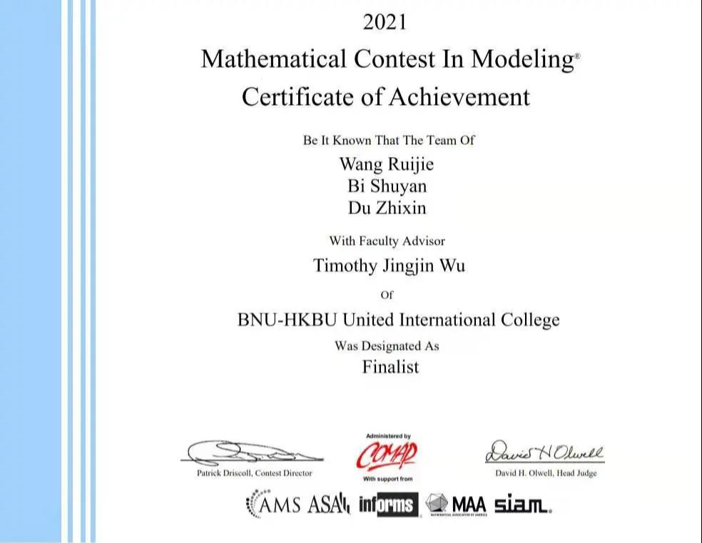 MCM/ICM, sponsored by the Consortium for Mathematics and Its Applications (COMAP), is the most influential mathematical modelling competition globally. A total of 26,112 teams from nearly 20 countries and regions participated in the competition, including students from Oxford University, Cambridge University, Tsinghua University, Cornell University, Peking University, Columbia University and many other renowned academies. UIC Year 3 students Wang Ruijie, Bi Shuyan, and Du Zhixin, majoring in Statistics Programme, were designated as Finalist. This year, the winning rate of this award was 2%, and it is also the first time that UIC students had won this award.