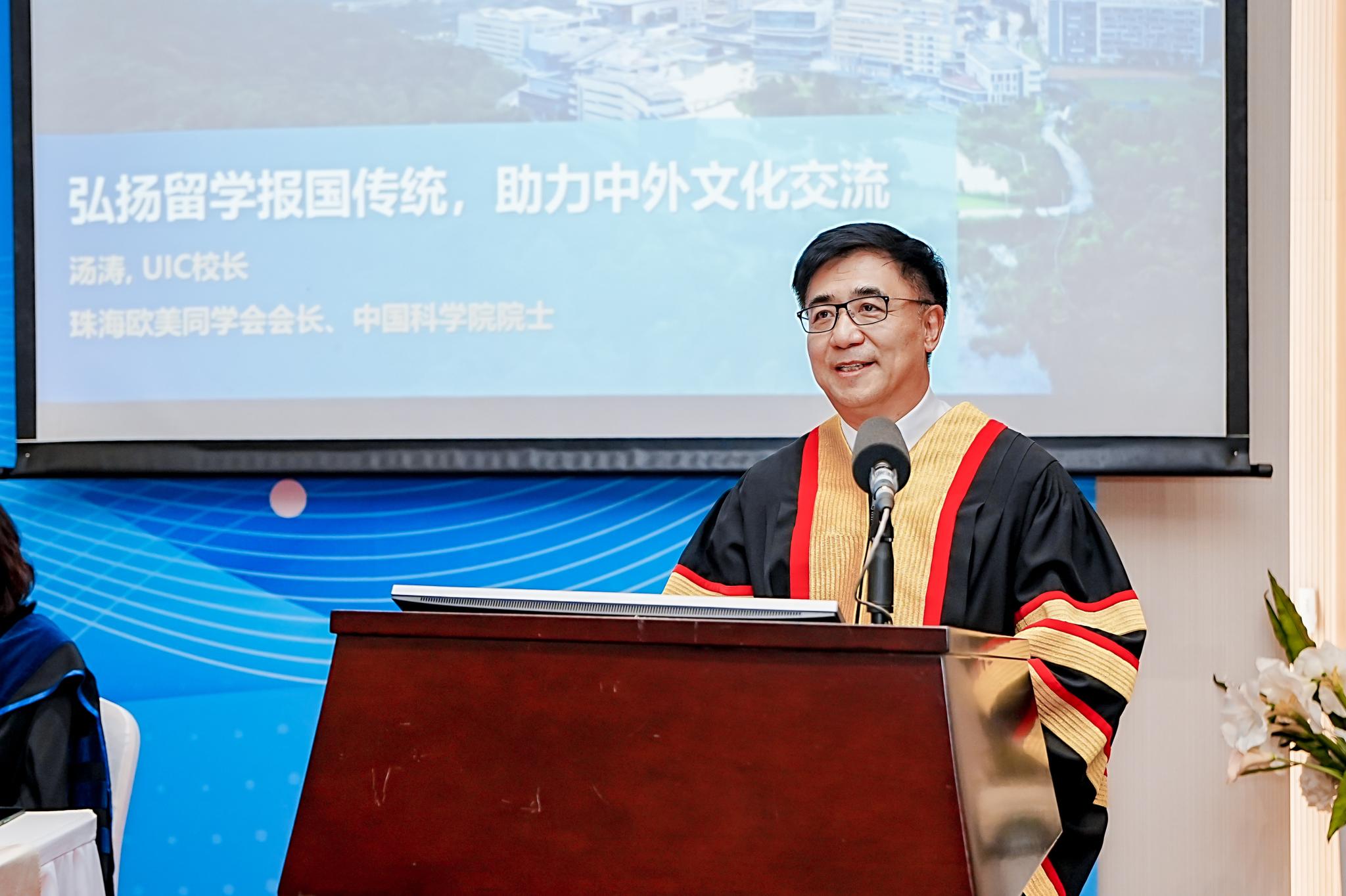 Member of the Chinese Academy of Sciences, UIC President and Chairman of the Association's Zhuhai Branch Prof Tang Tao introduced UIC's educational philosophy, resources and achievements, and later delivered a speech to inspire the talents who have studied abroad to contribute to the nation's development.