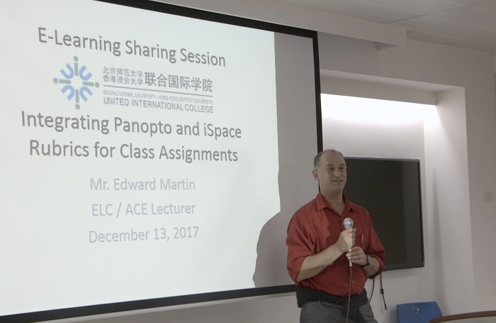 The next speaker was ELC and Academy of Continuing Education (ACE) Lecturer, Mr Edward Martin, who shared his experience and some tips for integrating iSpace assignment rubrics and Panopto video hosting into teaching. Panopto is like a campus YouTube (Youku), which allows UIC community members to share videos. Mr Martin showed attendees how to link student video assignments to iSpace for assessment. Mr Martin also encouraged attendees to explore new applications of Panopto to suit their own unique teaching contexts.