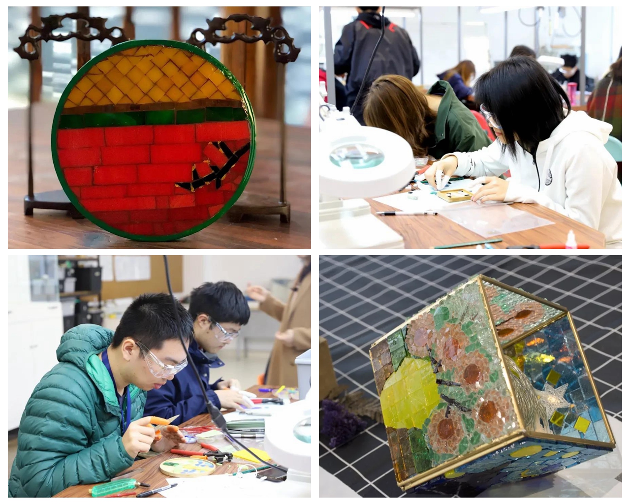 In the Glass Art Studio, besides mastering enamel craft and other techniques, students can also cultivate their awareness of colours and aesthetic ability in class, creating works combining traditional and modern crafts. It is also worth mentioning that students and teachers can also make wooden musical instruments at the Glass Art Studio.