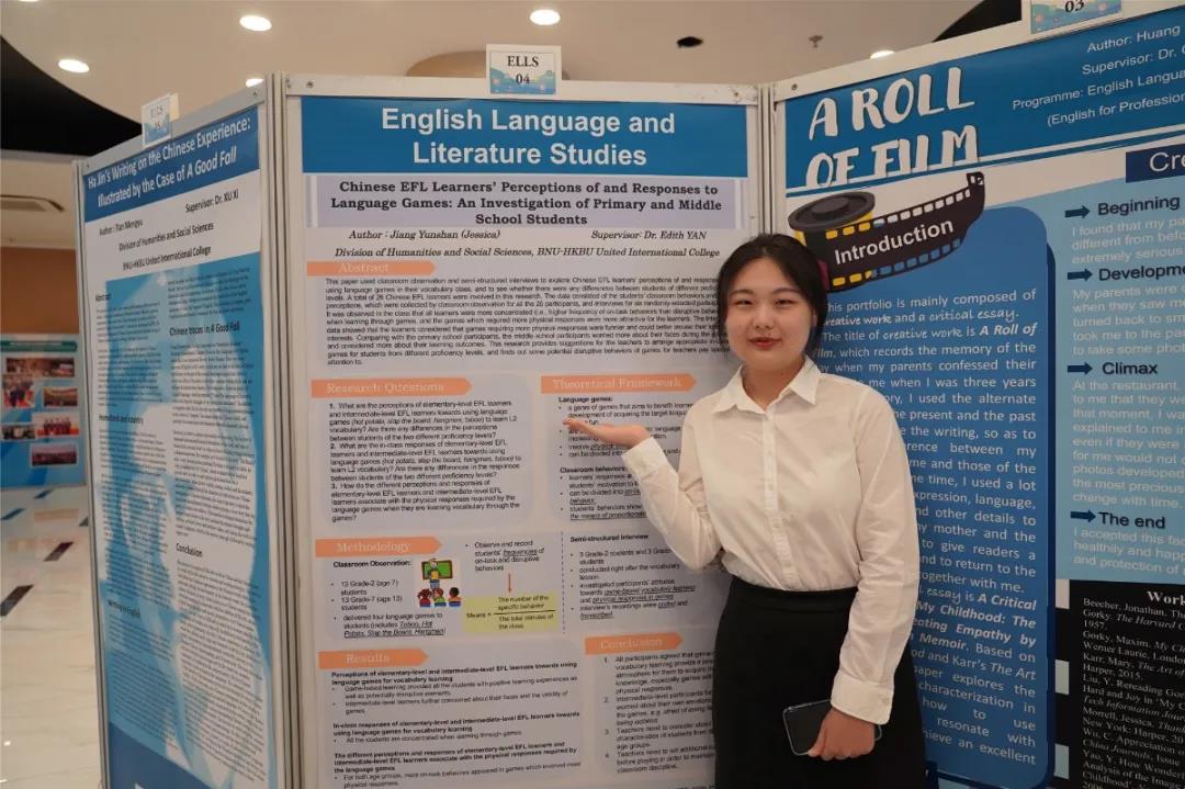 Jiang Yunshan, from the English Language and Literature Studies (ELLS) Programme, presented her FYP titled Chinese EFL Learners' Perceptions of and Responses to Language Games: An Investigation of Primary and Middle School Students. Majoring in Teaching English to Speakers of Other Languages (TESOL), Jiang Yunshan expected to have an in-depth study on teaching methods and explore the ways that can enable students to master language knowledge effectively.