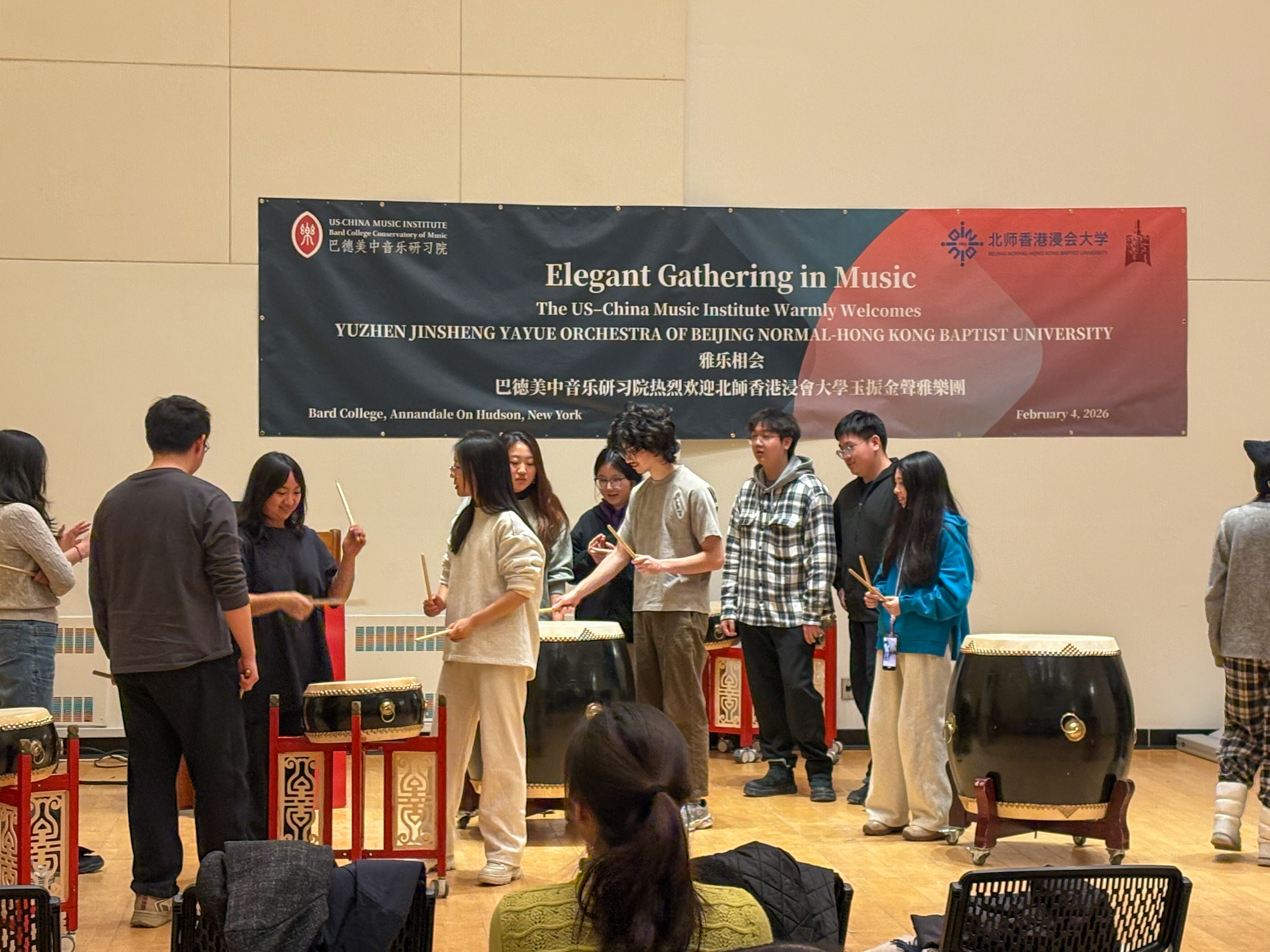 2月4日,雅乐团一行还受邀前往美国巴德学院开展深度文化交流,蔡金冬教授安排了学术研讨与乐器实操体验环节,让美国学子了解了中国雅乐的体系与复原历程,并亲手触摸编钟、感受丝竹之韵。蔡金冬教授以自身在西方音乐界的深厚积淀,为雅乐解读提供了跨文化视角,更促成了两校未来长效交流的意向,让这场巡演成为了中美古典音乐对话的重要纽带。