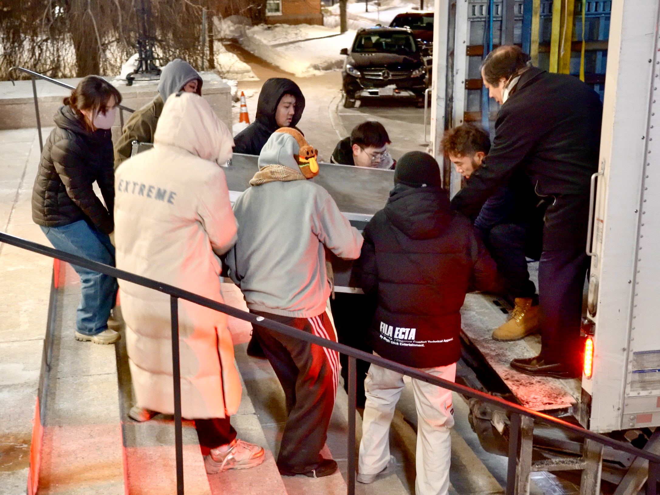 波士顿站演出结束,乐器需运至下一站纽约。不料货车因低温而无法放下装载架,大家只能协力将3.6吨的乐器搬上货车。没有犹豫,大家各自站好位置,抬起、传递、放稳,每一个动作都充满力量。