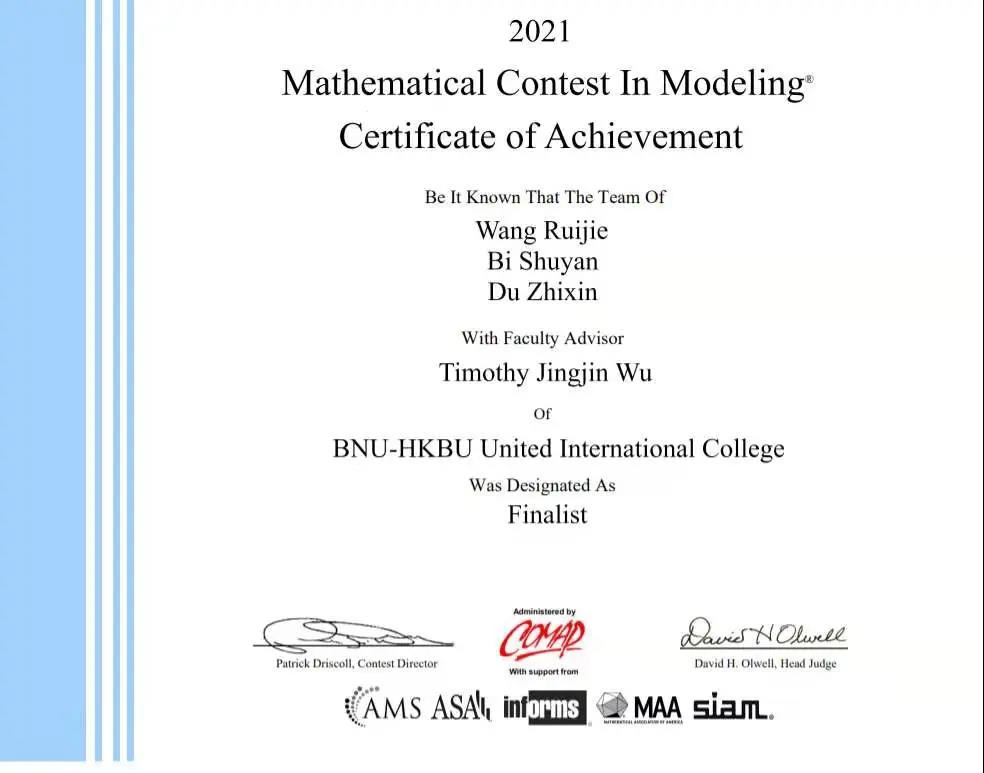 近日,2021年美国大学生数学建模竞赛(MCM/ICM,以下简称“美赛”)结果揭晓。北师港浸大(UIC)共19组同学获奖,包括1组特等奖提名(Finalist),4组一等奖(Meritorious Winners)以及14组二等奖(Honorable Mentions)。