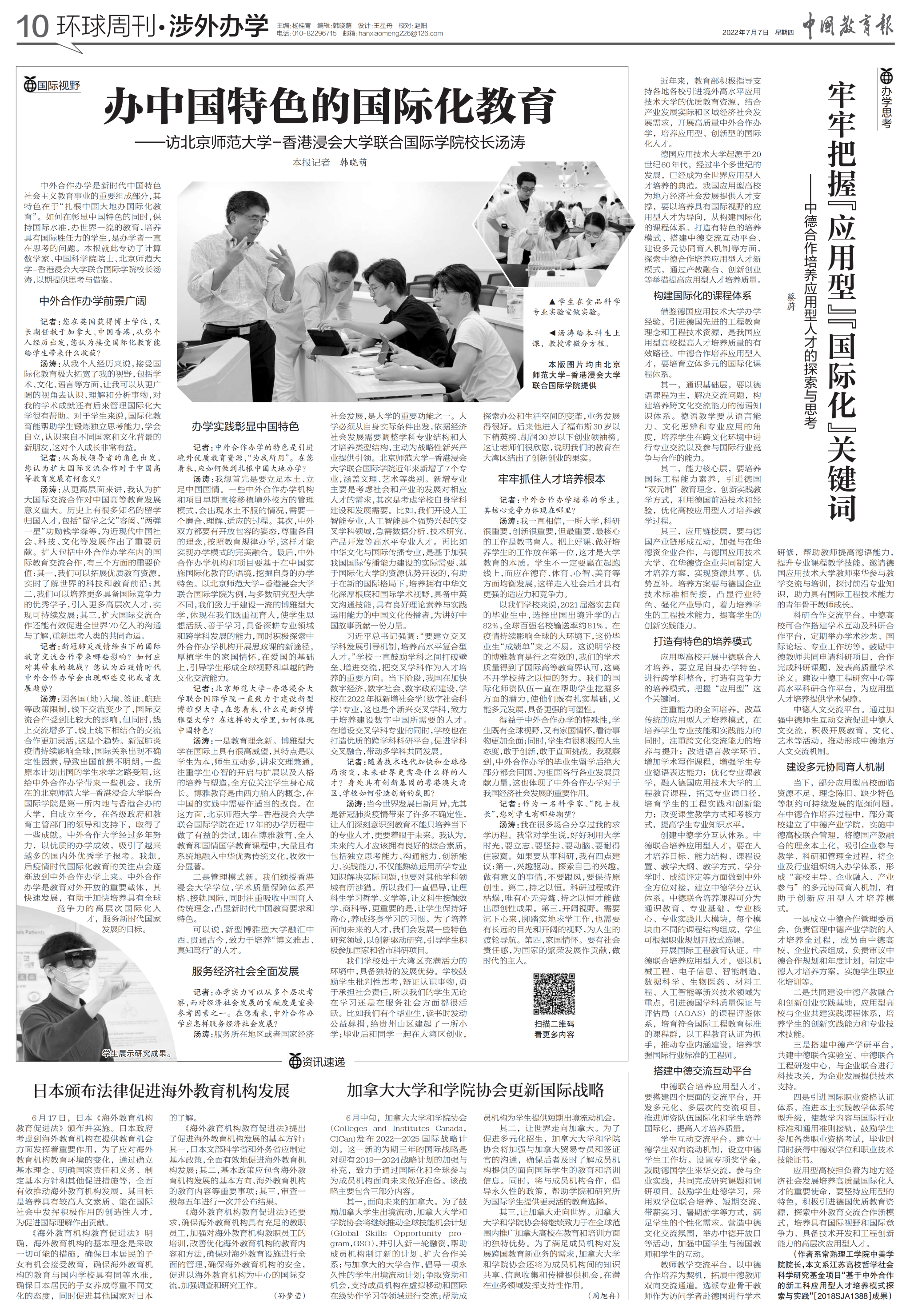汤涛:我想首先是要立足本土、立足中国国情。一些中外合作办学机构和项目早期直接移植境外校方的管理模式,会出现水土不服的情况,需要一个磨合、理解、适应的过程。其次,中外双方都要有开放包容的姿态,尊重各自的理念,按照教育规律办学,这样才能实现办学模式的完美融合。最后,中外合作办学机构和项目要基于在中国实施国际化教育的语境,挖掘自身的办学特色。以北京师范大学-香港浸会大学联合国际学院为例,与多数研究型大学不同,我们致力于建设一流的博雅型大学,体现在我们既重视育人,使学生思想活跃、善于学习,具备深耕专业领域和跨学科发展的能力,同时积极探索中外合作办学机构开展思政课的新途径,厚植学生的家国情怀,在爱国的基础上,引导学生形成全球视野和卓越的跨文化交流能力。