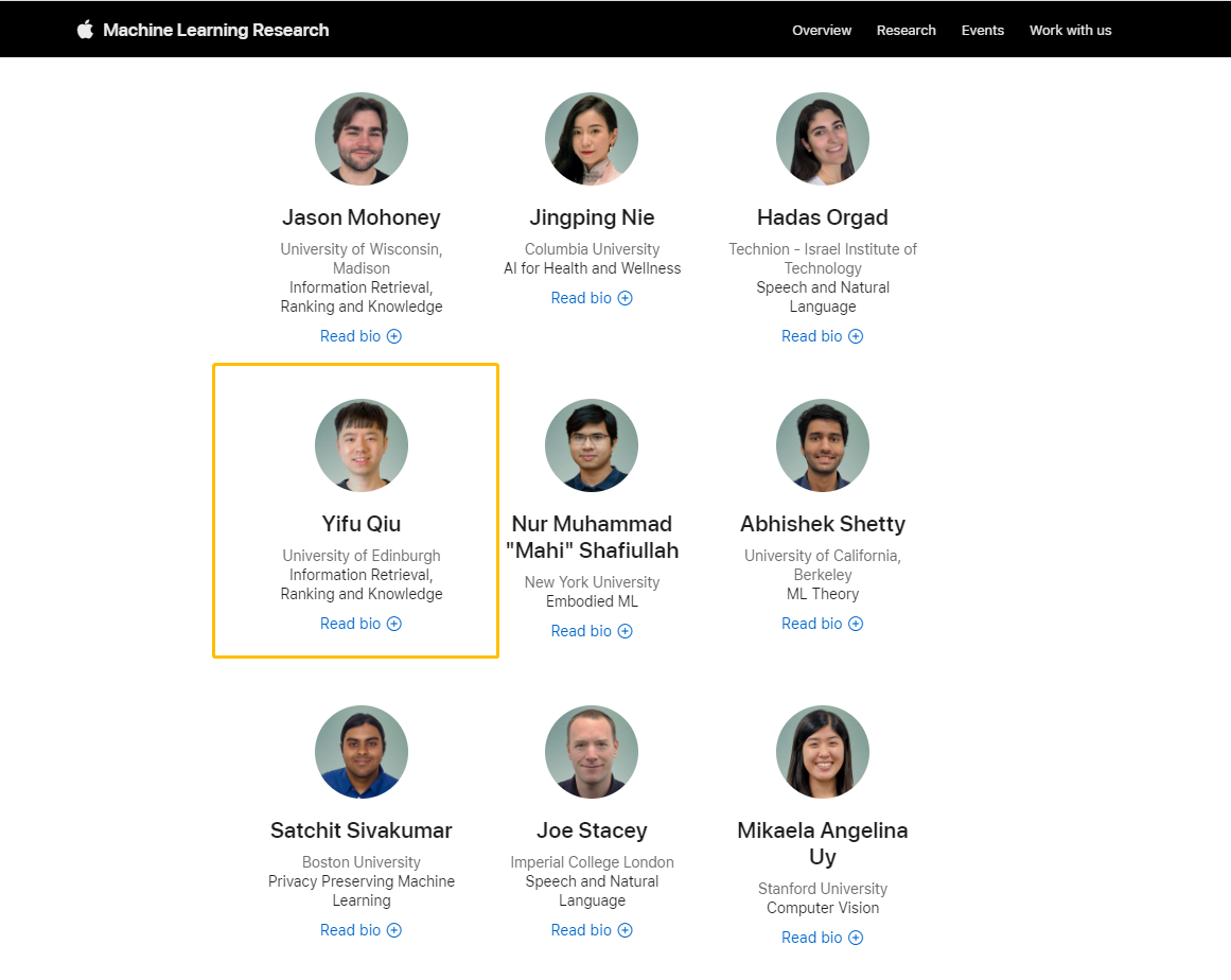 苹果机器学习研究中心网站公布的名单,仇毅夫位列其中