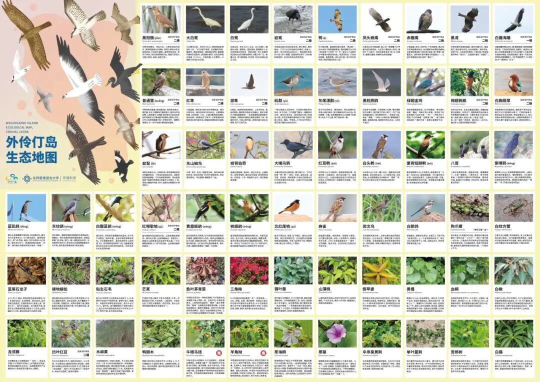 为让生态数据更具实用价值,团队精选63种重点保护物种与常见物种,由环境科学专业大三学生关力玮完成资料收集与整理,专业团队主持设计,结合外伶仃岛经济、文化、旅游特色,最终编制成兼具科学性与趣味性的外伶仃岛生态地图。