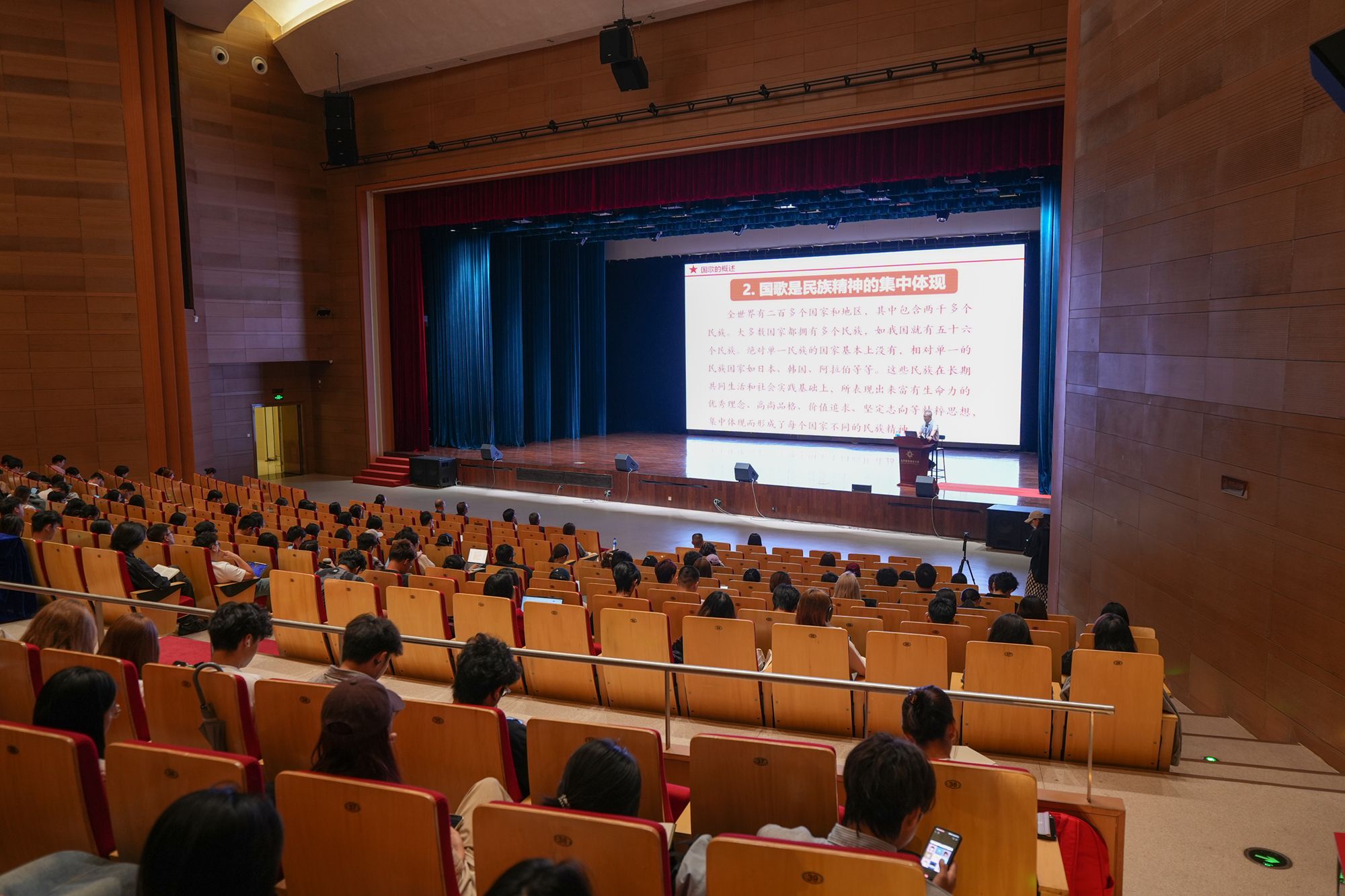 讲座最后,在于海教授的指挥下,全场师生起立,齐声高唱《义勇军进行曲》。激昂的旋律在大学会堂内回荡,每一个人的心中都涌动着对祖国的热爱与自豪。